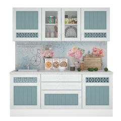 Фасады: МДФ рамочные, декор – «кремовый белый» с эффектом патины, матированное стекло с рисунком